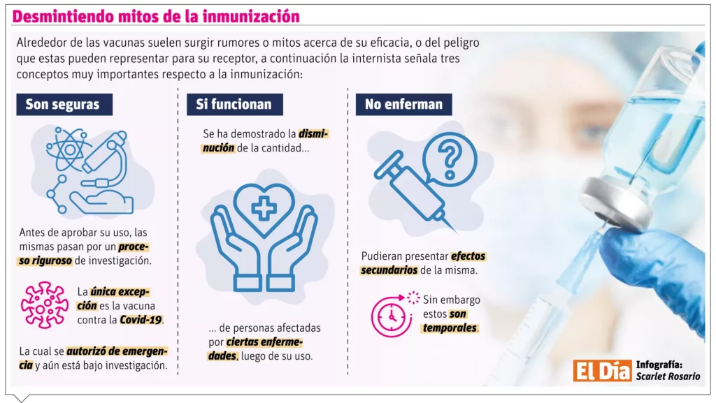 La médica detalla que las vacunas ayudan a que el cuerpo cree anticuerpos, preparándolo para batallar contra los gérmenes en caso de que estén en contacto posterior a su administración. Algunas solo requieren una dosis, otras dos o más; también están las que requieren refuerzos cada cierto tiempo.