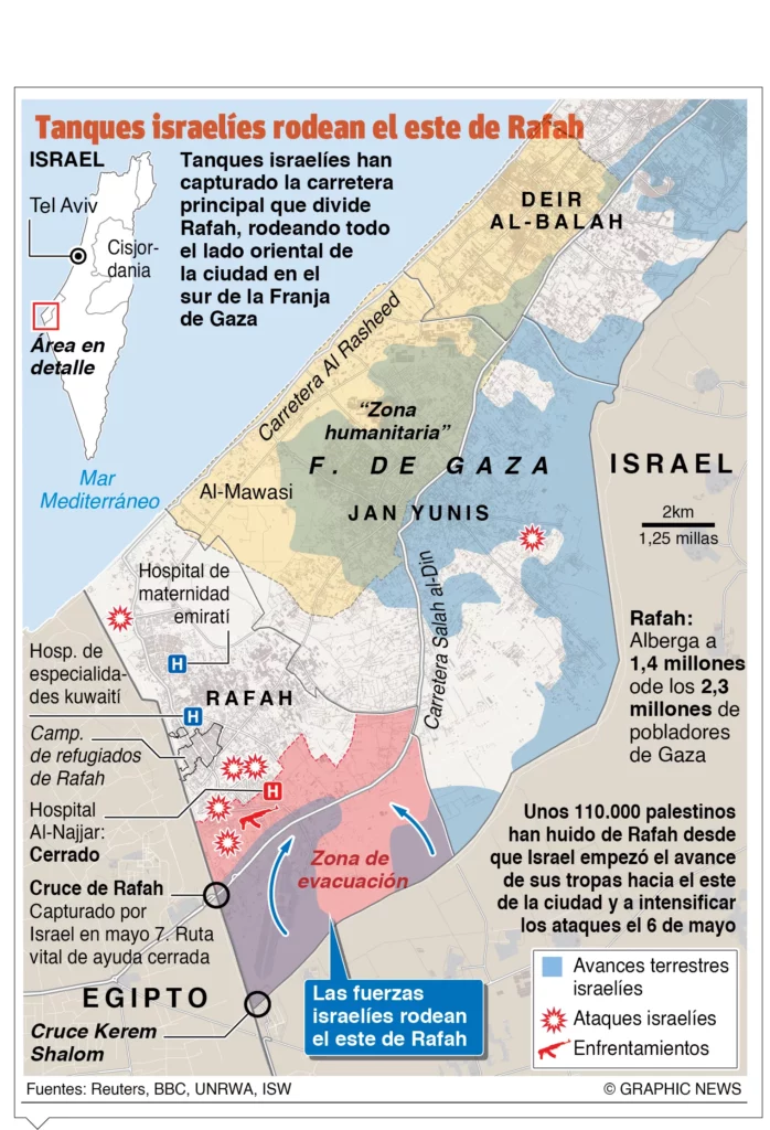 La toma la semana pasada del paso fronterizo de Rafah, que conecta Gaza con Egipto, y los ataques de Israel contra la localidad palestina homónima han deteriorado en gran medida las relaciones entre Tel Aviv y El Cairo, que desde el inicio de la guerra ha advertido contra el desplazamiento de los palestinos de la Franja.