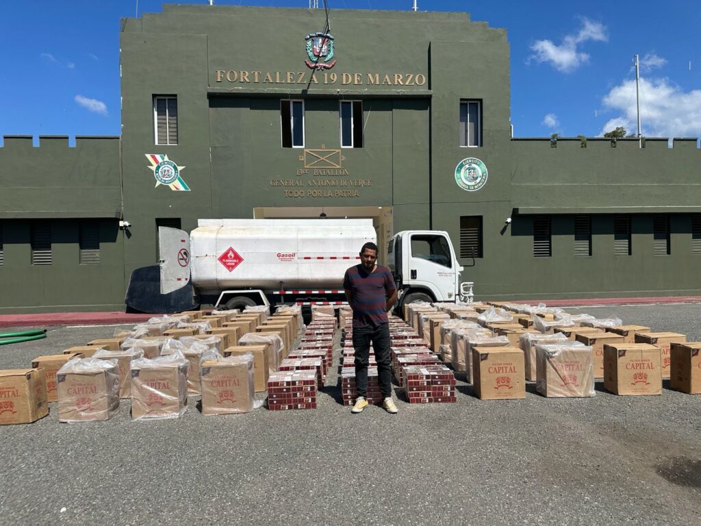 Santo Domingo.– El Ejército de República Dominicana (ERD) detuvo a un hombre que transportaba un cargamento de más de un millón de cigarrillos introducidos ilegalmente al país, ocultos en un camión tipo tanquero, en el puesto de chequeo militar del kilómetro 15 de Azua.