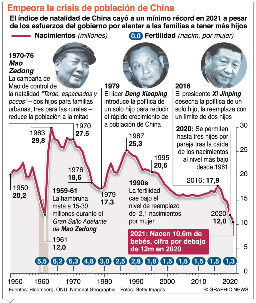 Las cifras han provocado advertencias en China, donde la producción económica por persona, inferior a la media global, podría enfrentar una “bomba demográfica” y verse con trabajadores insuficientes para respaldar a un creciente número de ancianos.