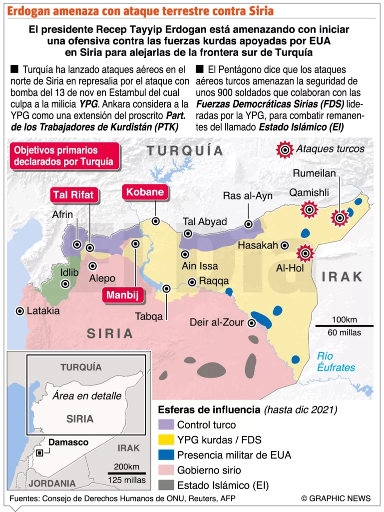 En tanto, cientos de kurdosirios se manifestaron ayer en varias localidades del noreste de Siria para protestar contra la campaña de ataques aéreos y artilleros turcos iniciada hace una semana en las áreas septentrionales del país árabe.