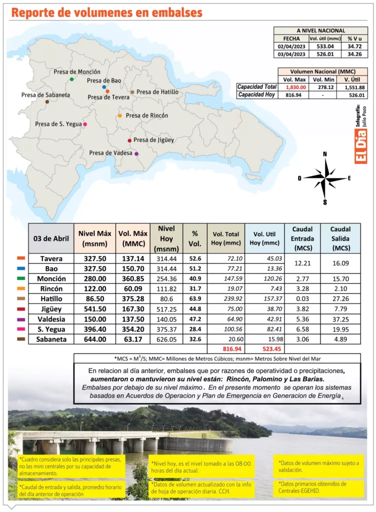 De todos los embalses la situación más crítica la tiene la presa Rincón, donde el caudal promedio de marzo es de 3.40 de metros cúbicos, reveló el director INDRHI.