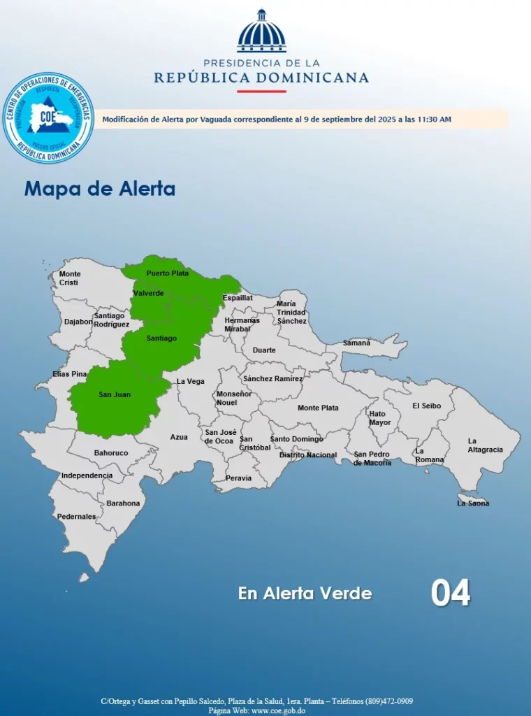 Sin embargo, el COE también informó que descontinuó la alerta para las provincias Monseñor Nouel, San José de Ocoa, Elías Piña, Dajabón y La Vega, porque el sistema atmosférico ya no representa peligro para sus comunidades, aunque se espera la ocurrencia de lluvias durante el transcurso del día.