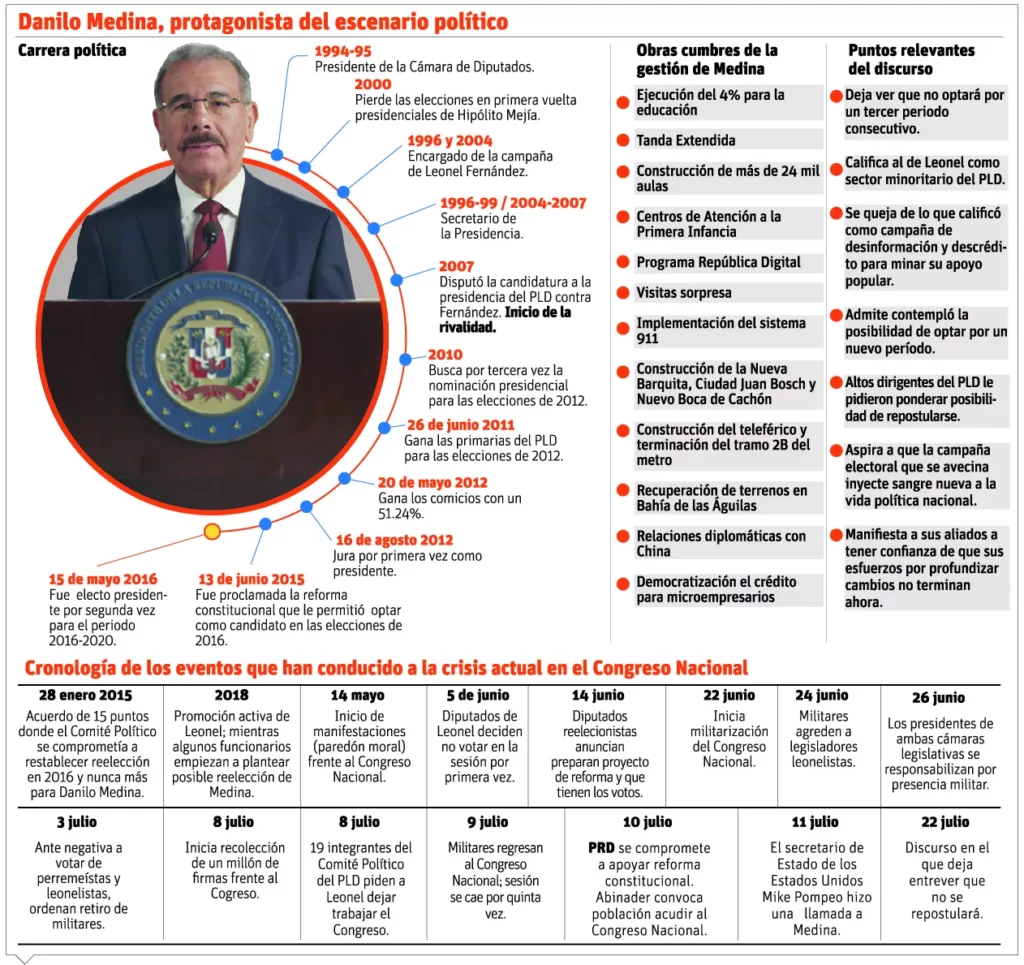 Anoche el Jefe del Estado despejó la incertidumbre de buscar un tercer periodo, pero en una alocución a la nación dejó abierta la posibilidad de que el Congreso Nacional pondere la convocatoria de la Asamblea Revisora para modificar la Carta Magna, lo que ha sido centro de enfrentamientos entre los diputados que le siguen y los abanderados en el litoral del expresidente Leonel Fernández.