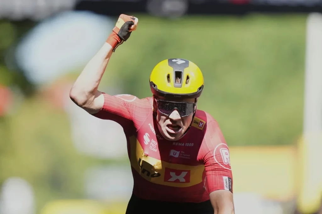 Van der Poel bajó la cabeza y se desplomó sobre su bicicleta mientras terminaba 7 segundos detrás en tercer lugar, mientras que el grupo de la clasificación general, que incluía a Pogačar y al poseedor de la camiseta amarilla, Ben Healy, terminó 3:28 detrás.