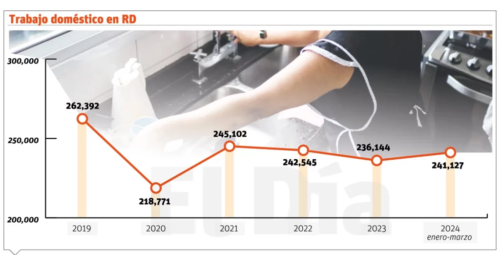 Cuando se analiza la evolución del empleo doméstico desde 2019 hasta 2023, el sector doméstico ha experimentado una caída considerable, con el punto más bajo en 2023 y una recuperación parcial en 2024 con 241,127 personas ocupadas en ese sector. Ese sector representa en el contexto de los 4,878,420 trabajadores totales en el país, aproximadamente el 4.94 % de la fuerza laboral dominicana.