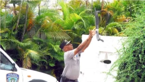 Ramón Luciano,un hombre joven con posible problema mental permanecio por mas de cinco dias encima del edificio donde antes existia la segunda circuncricion del distrito,situada en la Galvan con mexico,fue rescatados por el 911,la policia y los bombero,en la foto un agente de la policia sostiene una escopeta encontrada junto al hombre/foto Jose de Leon