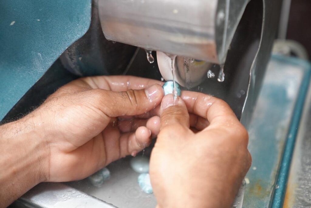 “El larimar ahuyenta las malas energías”, dice la mujer tras dedicar los primeros años de su vida a sostener el hogar mientras su esposo trabajaba con el larimar y que lleva ya siete años confeccionando la piedra.