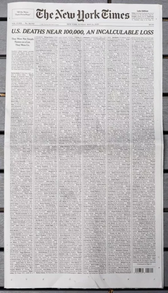 La impactante imagen de la primera página, muy compartida en redes sociales, es una larga lista a seis columnas que pone nombre, edad e historia vital a las crudas cifras de la tragedia bajo el titular "Las muertes en EE.UU. se acercan a 100.000, una incalculable pérdida", recordando que esas personas "éramos nosotros".