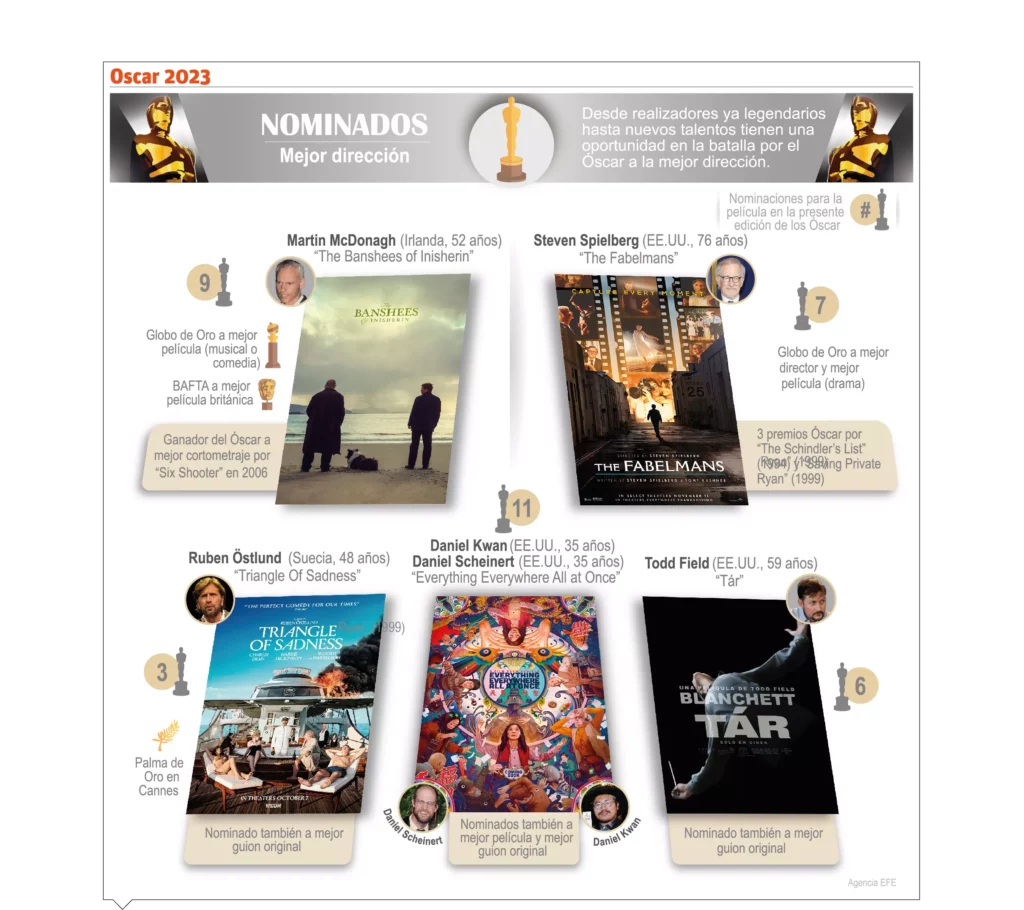 Agencias.-La carrera por el Óscar a la mejor dirección se resolverá este domingo, pero ya parece contar con claros favoritos, un dos contra uno entre Daniel Kwan y Daniel Scheinert por la sorpresa de la temporada, “Eveything Eveywhere All at Once”, y Steven Spielberg por su personalísima “The Fabelmans".