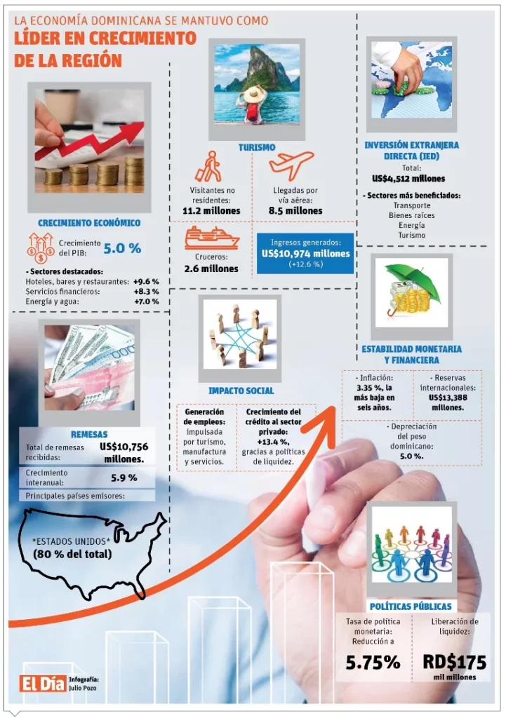 Entre los principales motores de ese desempeño, liderando a los países de América Latina en crecimiento del PIB con relación al 2023, fue motorizado por sectores como el turismo, las remesas, inversión extranjera y zonas francas, mientras que a nivel local se destacaron la manufactura, energía, transporte y construcción.