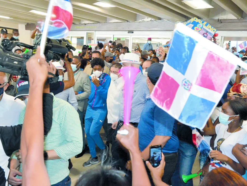 SANTO DOMINGO.-Miles de habitantes se las ingeniaron este martes para llegar hasta el aeropuerto Las Américas y dar una calurosa bienvenida a la brillante doble medallista olímpica (plata), Marileidy Paulino, y demás miembros de la delegación dominicana de atletismo, que compitió en los Juegos de Tokio 2020.