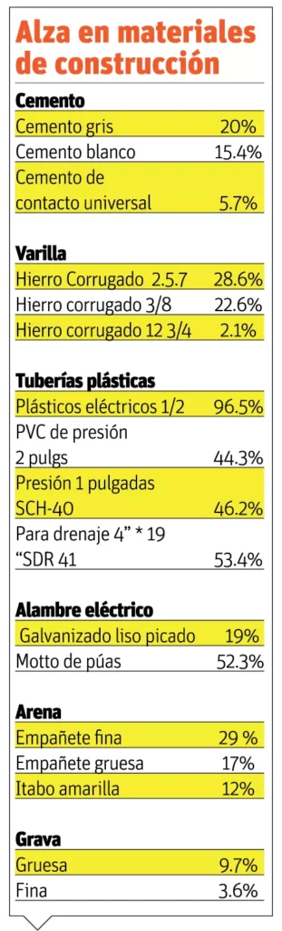 La construcción ha experimentado alzas significativas del acero, las varillas de construcción, el cemento gris, las tuberías y piezas de PVC, los alambres lisos y eléctricos, agregados así como los bloques y el hormigón, que han aumentado su valor desde un 12 a un 40%, desde que inició ésta escala alcista en el mes de marzo del 2020.