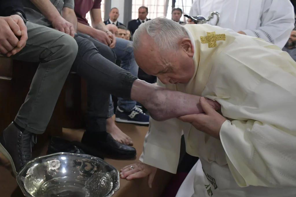El pontífice acudió a la Casa del Marmo en Roma, una cárcel de menores ubicada en la periferia de Roma, donde tras su homilía, en la que animó a los fieles a ayudarse entre sí, se levantó de su silla de ruedas para lavar y besar los pies diez hombres y dos mujeres.