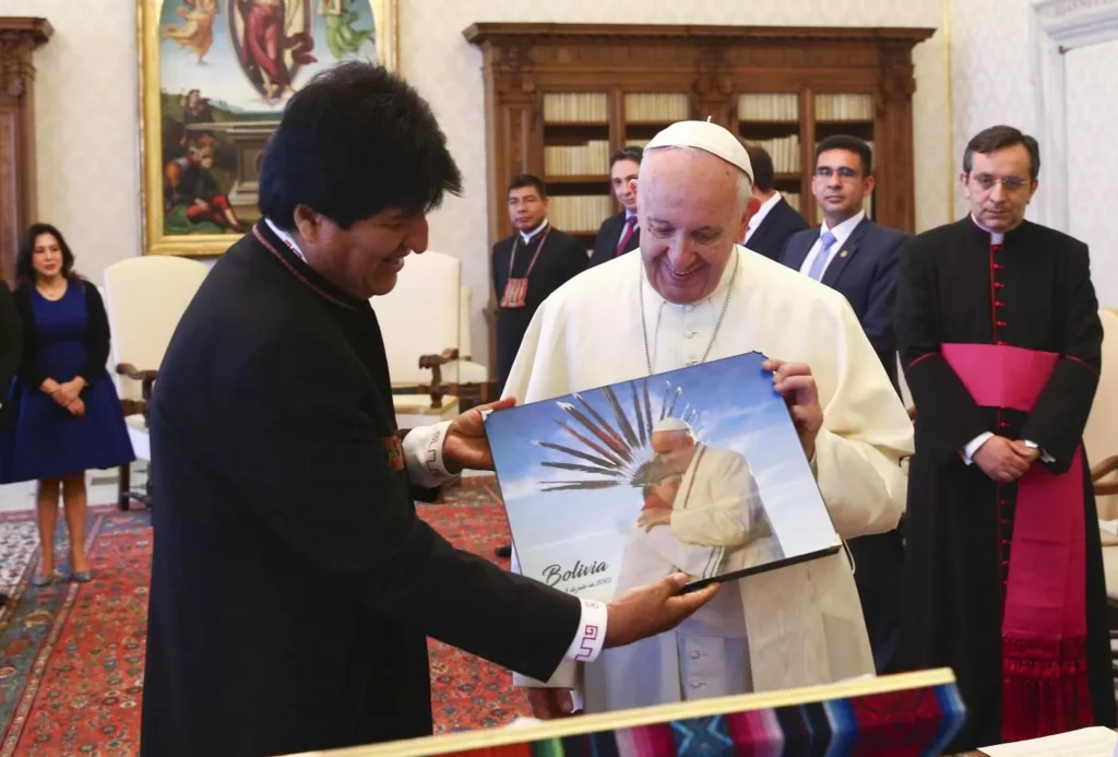 El mandatario ofreció un ajedrez de madera de estética indígena y una fotografía en la que se ve al papa abrazando a un niño boliviano con un sombrero en el viaje que realizó al país andino en julio de 2015, y al verla Francisco dijo “mira qué bonita".
