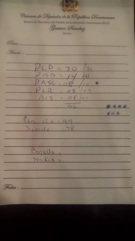Al parecer, Sánchez no está seguro de contar con el voto del exreformista Víctor –Ito-Bisonó, y por eso dice en su nota “Con Ito = 99”, “Sin Ito = 98”.