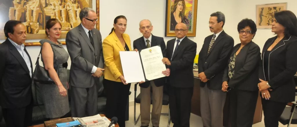 El pergamino de reconocimiento al veterano comunicador le fue entregado por Peggy Cabral, presidenta dela Comisión y viuda del extinto líder José Francisco Peña, quien formó parte del movimiento insurreccional y llamó al pueblo a respaldarlo.