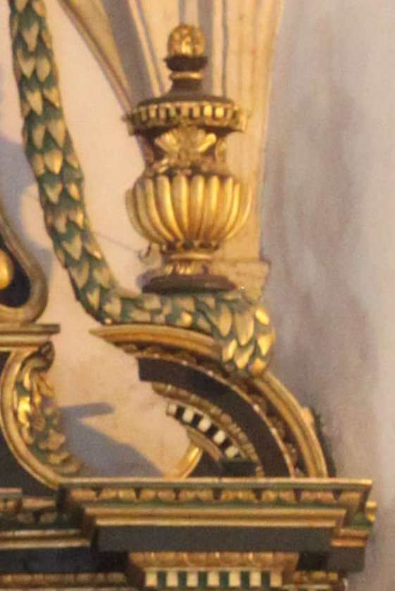 A los lados, dos columnas con capiteles dóricos, los que encierran adornos vegetales en pan de oro. Desde el tope de las columnas, desciende un adorno a guisa de cordón, también cubierto con pan de oro, el que termina debajo de un par de copones.