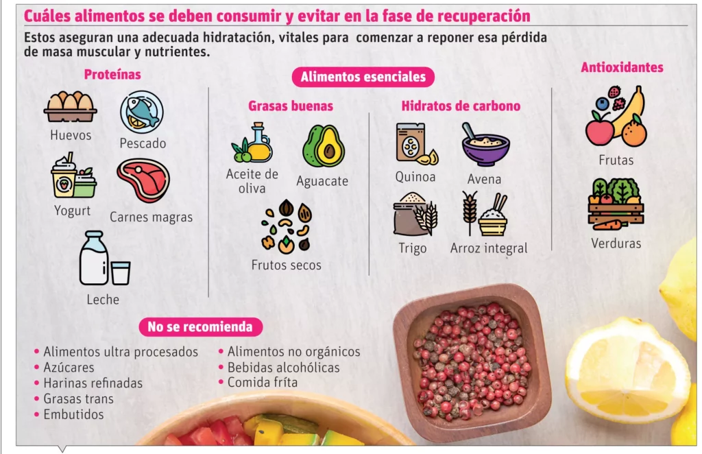 De acuerdo a la nutrióloga clínica Keila Guzmán, es vital que la población no se descuide con su alimentación, al indicar que esta juega un papel muy en la fase de recuperación, porque las defensas están debilitadas debido a la pérdida de masa muscular y pérdida de nutrientes, entonces lo ideal es mantener una alimentación saludable, asegurando una adecuada hidratación y comenzar a reponer esa pérdida.