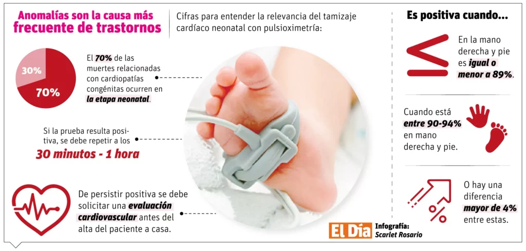 Otras cardiopatías como defectos septales, persistencia del conducto arterioso, entre otras, pueden tener una pulsioximetría normal al momento del nacimiento, pero empezar a desarrollar síntomas más adelante, alrededor de las 3 a 4 semanas de edad.
