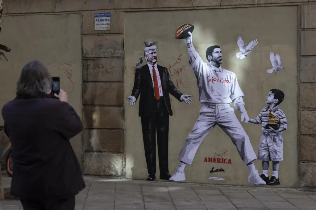Barcelona.- Un grafiti del artista tinerfeño Alberto León en el centro de Barcelona reivindica la paz frente al presidente estadounidense Donad Trump, con una imagen del cantante puertorriqueño Bad Bunny en su espectáculo de la Super Bowl, de la mano de un niño detenido por la policía migratoria.