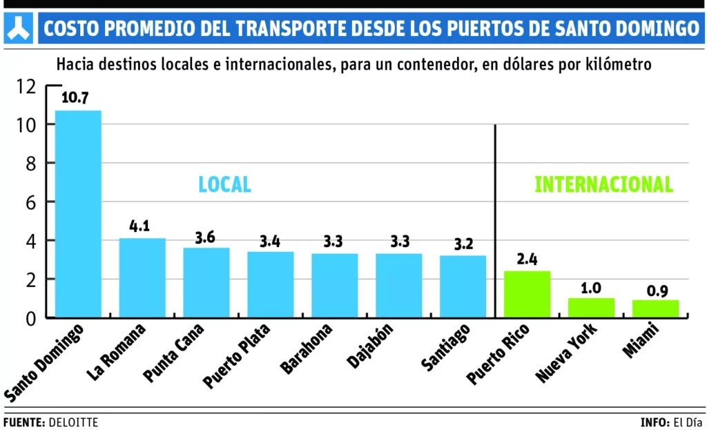 Por ejemplo, describe que el precio promedio de enviar un contenedor en Santo Domingo es de 10.7 dólares por kilómetro, a La Romana cuesta 4.1 dólares, y a Punta Cana 3.6 dólares.