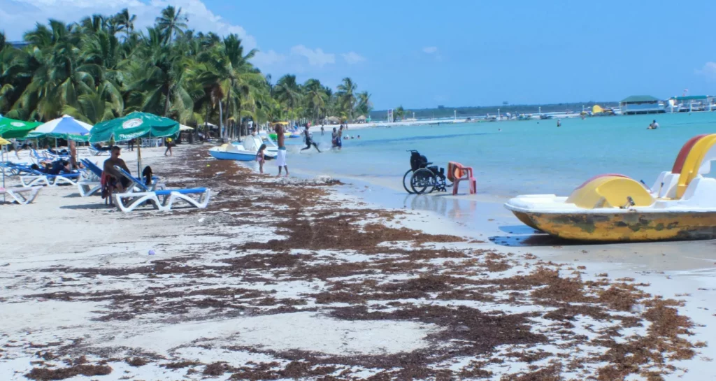 Pese a que el panorama ha mejorado, en la playa de Boca Chica son pocos los bañistas que se atreven a darse un chapuzón en las azules aguas manchadas de marrón por las plantas que se rehusan a dejar la costa este y sur del país.