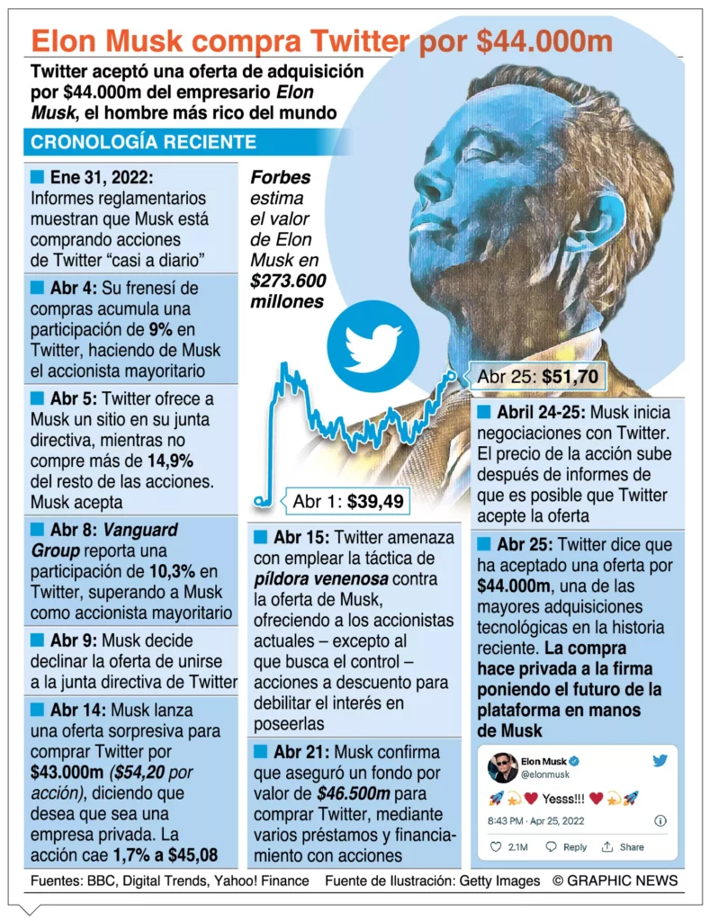 Se espera que la operación de compra, en la que Musk pagará 54,20 dólares por título de Twitter, se cierre en algún momento de este año una vez den su aprobación los accionistas y reguladores, luego de lo cual la red social dejará de cotizar en la bolsa.