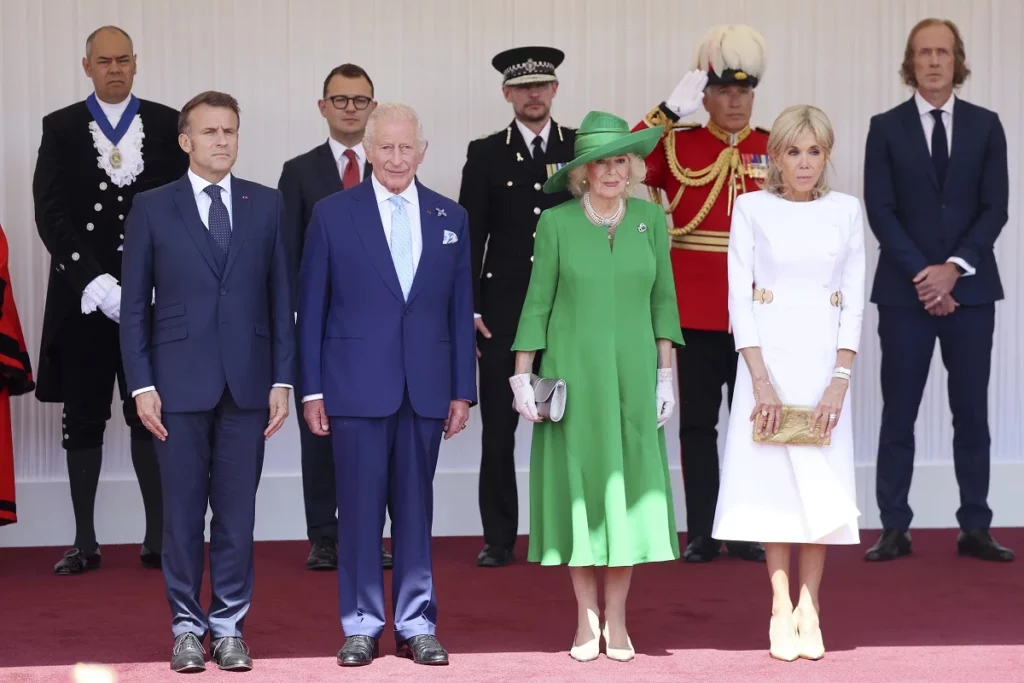 Desde esta base, donde también estaba la embajadora francesa en el Reino Unido, Hélène Duchêne, los Macron y los príncipes de Gales se dirigieron en coche hasta el castillo de Windsor, a las afueras de Londres, para ser recibidos con honores por los reyes Carlos III y Camila.