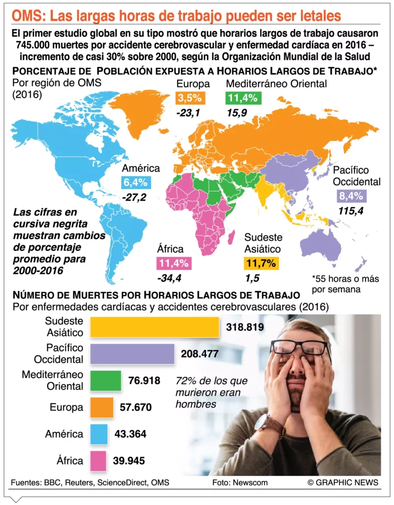 La ONU publicó un informe que cifra en 745,000 las muertes anuales globales por los crecientes problemas cardiovasculares ligados a largas horas de trabajo. Pide limitar los horarios laborales en todos los sectores.