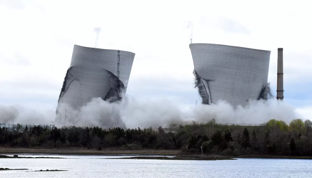 Un video mostró las enormes torres ubicadas a lo largo de Mount Hope Bay desplomarse antes de provocar que una gran nube de polvo se alzara por los aires. La planta quemaba carbón desde 1963 y las torres de enfriamiento se construyeron décadas después.