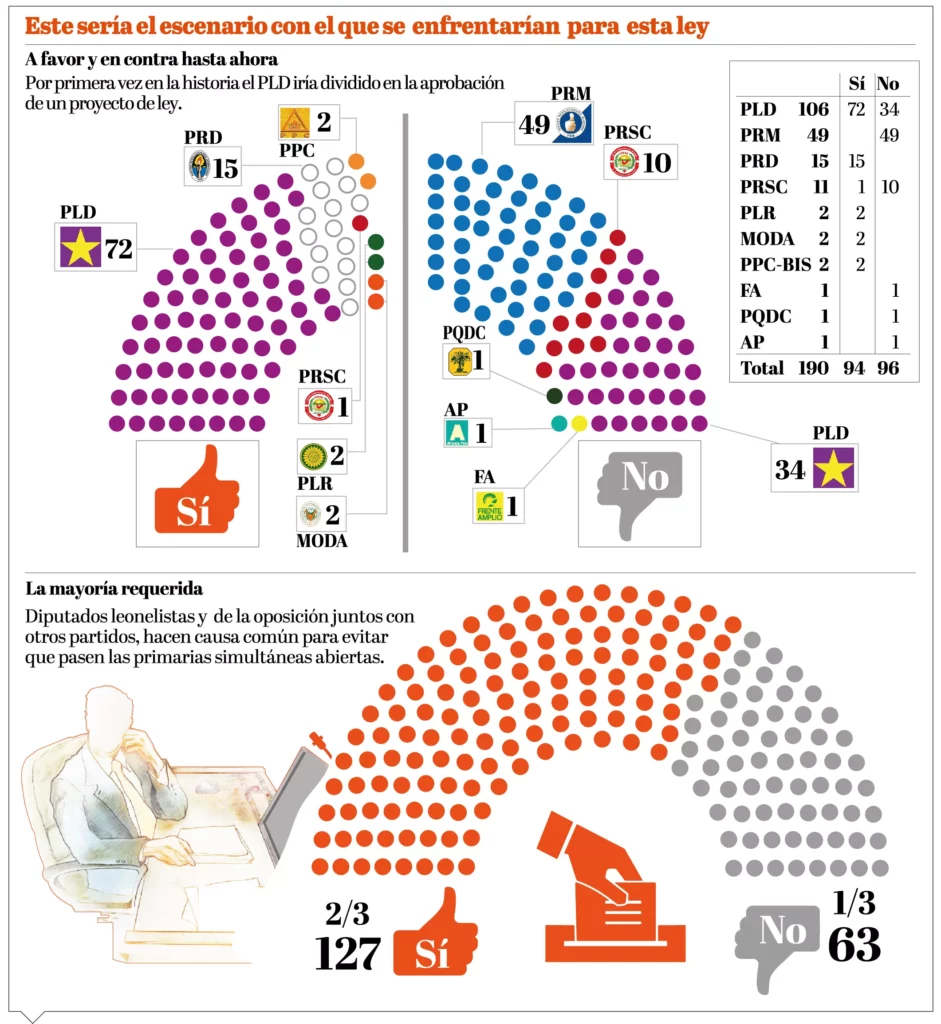 En esta ocasión, por primera vez, el Partido de la Liberación Dominicana va con el bloque dividido para la aprobación de un proyecto, luego de que el Comité Político dejara libres a sus legisladores para que tomaran su decisión en torno al tema de las primarias, si abiertas o cerradas.