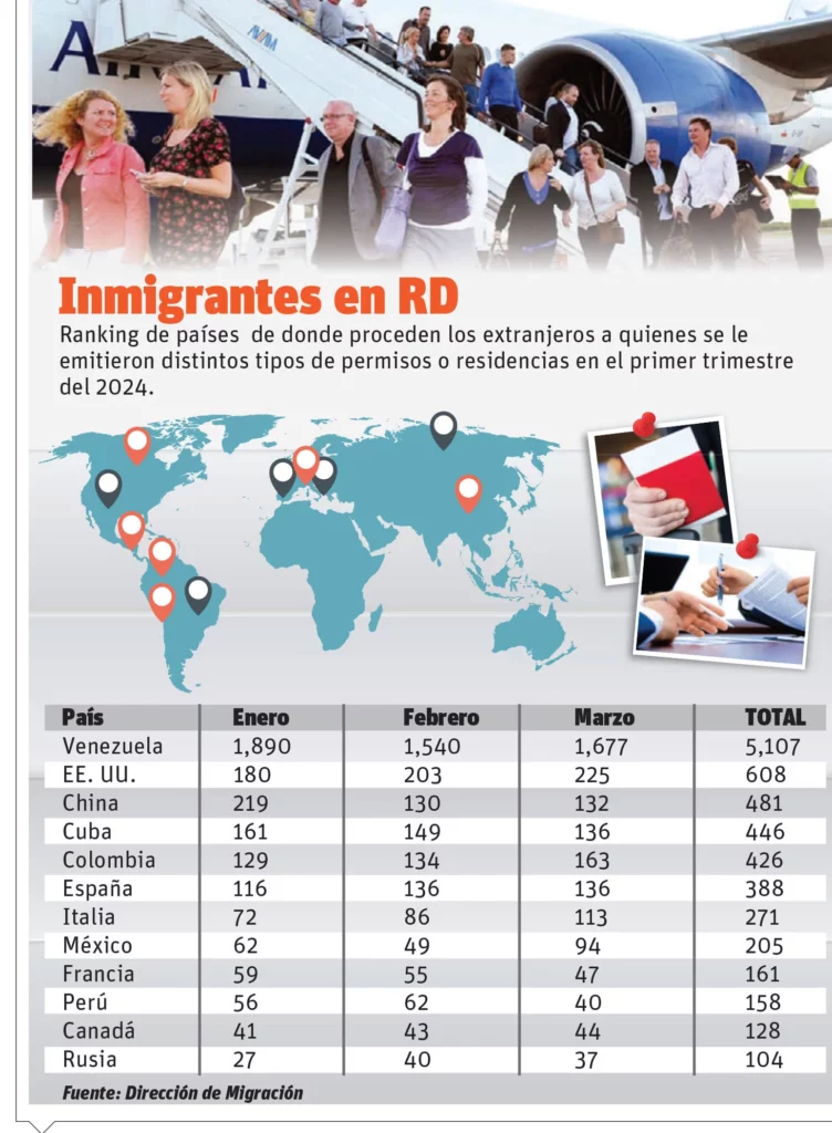 Y esto a propósito de las más de 9,837 personas procedentes de 99 países que optaron y recibieron algún tipo de residencia en República Dominicana el primer trimestre del 2024, de acuerdo a datos de la Dirección General de Migración colgados en su página web.