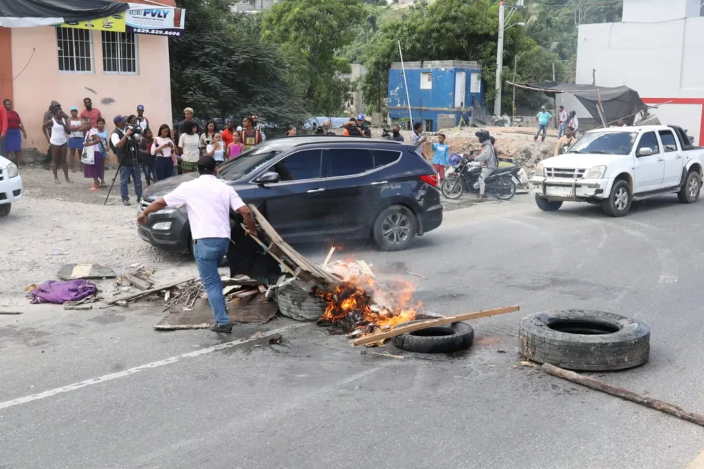 Manifestación en el lugar del accidente en la carretera Mella, los ciudadanos han encendido neumáticos y han tirado desperdicios en la vía en reclamo a que siga la búsqueda.