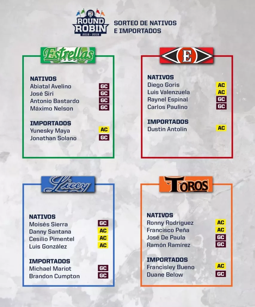 En tanto que los Leones del Escogido reforzaron el equipo con los nativos Diego Goris y Luis Valenzuela, de las Águilas Cibaeñas, así como Raynel Espinal y Carlos Paulino de los Gigantes del Cibao; el importado seleccionado por los escarlatas fue Dustin Antolin de las Águilas Cibaeñas.