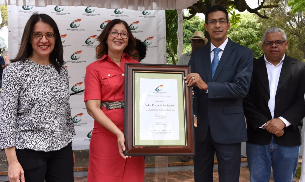 La escritora Dulce Elvira de los Santos recibió el pergamino de la mano del viceministro de Cultura, Juan Morales, en representación del ministro de Cultura, Pedro Vergés. En el acto también estuvieron Valentín Amaro, miembro del consejo ejecutivo de la Feria Internacional del Libro, así como familiares, amigos y allegados que se dieron cita al recinto ferial para ser parte de este reconocimiento.