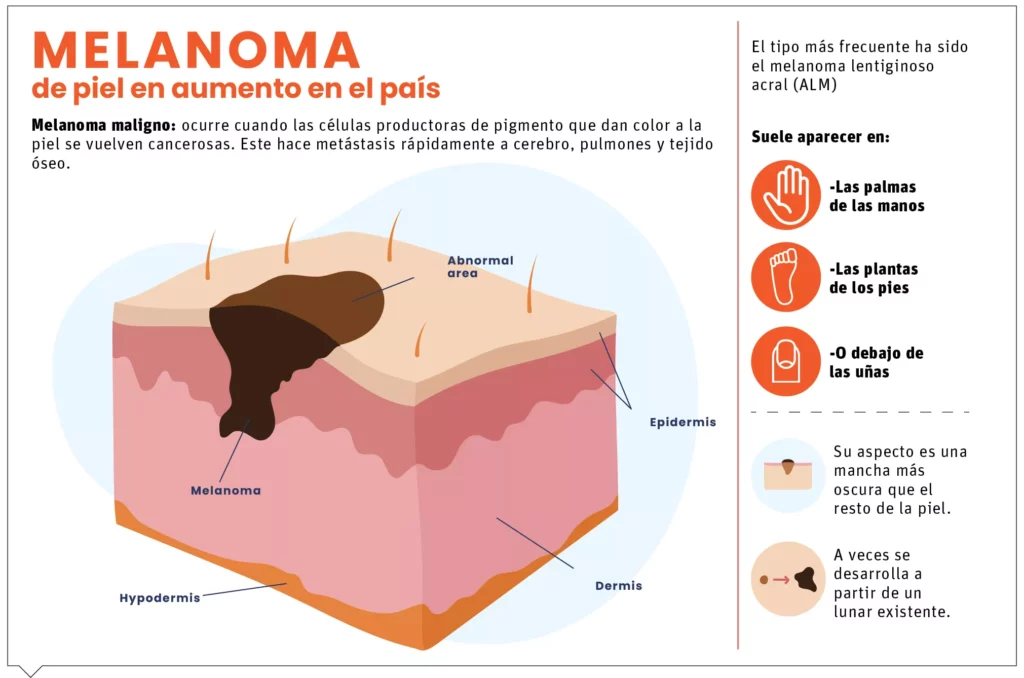 Especificó que el melanoma que están viendo en los pacientes es el acral lentiginoso, que es un tipo de lesión que se presenta con mayor frecuencia en las plantas de los pies.