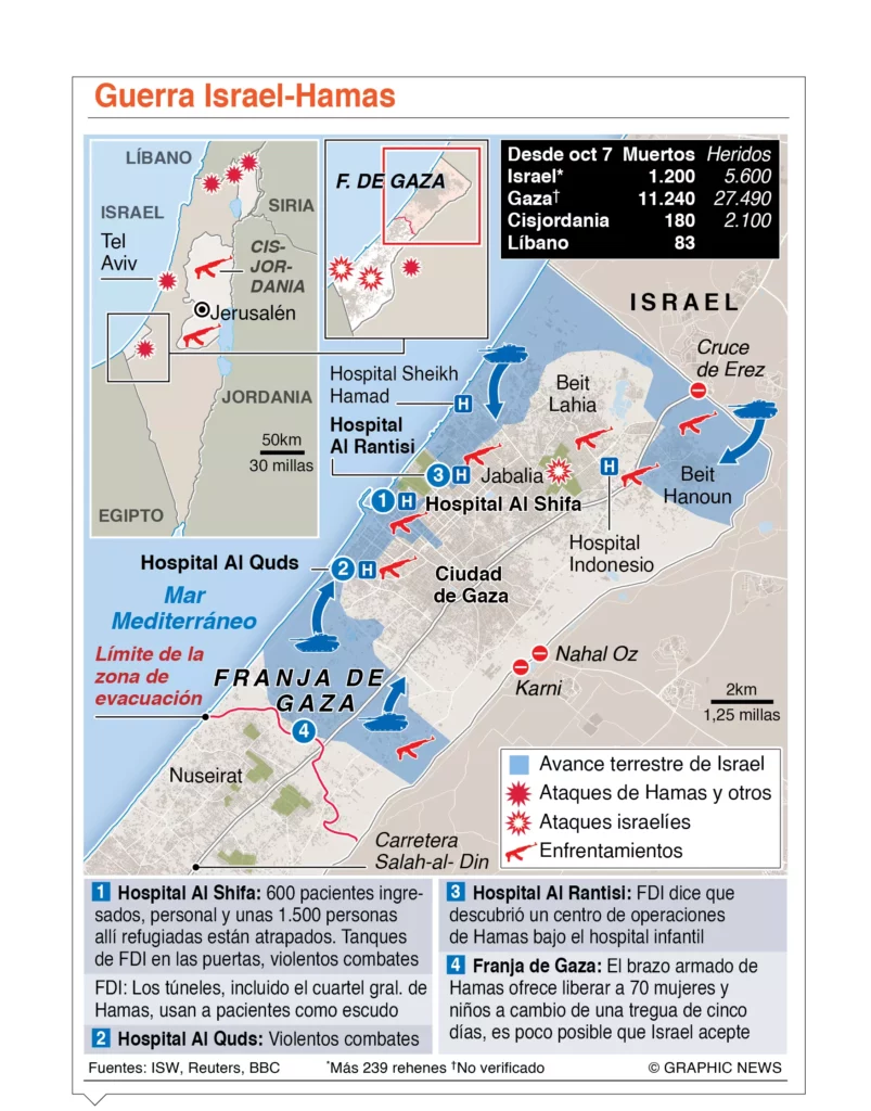 Desde entonces, los ataques de represalia israelíes -por aire, mar y tierra- han dejado más de 11.180 muertos, 28.200 heridos, 3.000 desaparecidos y más de 1,5 millones de desplazados en Gaza.