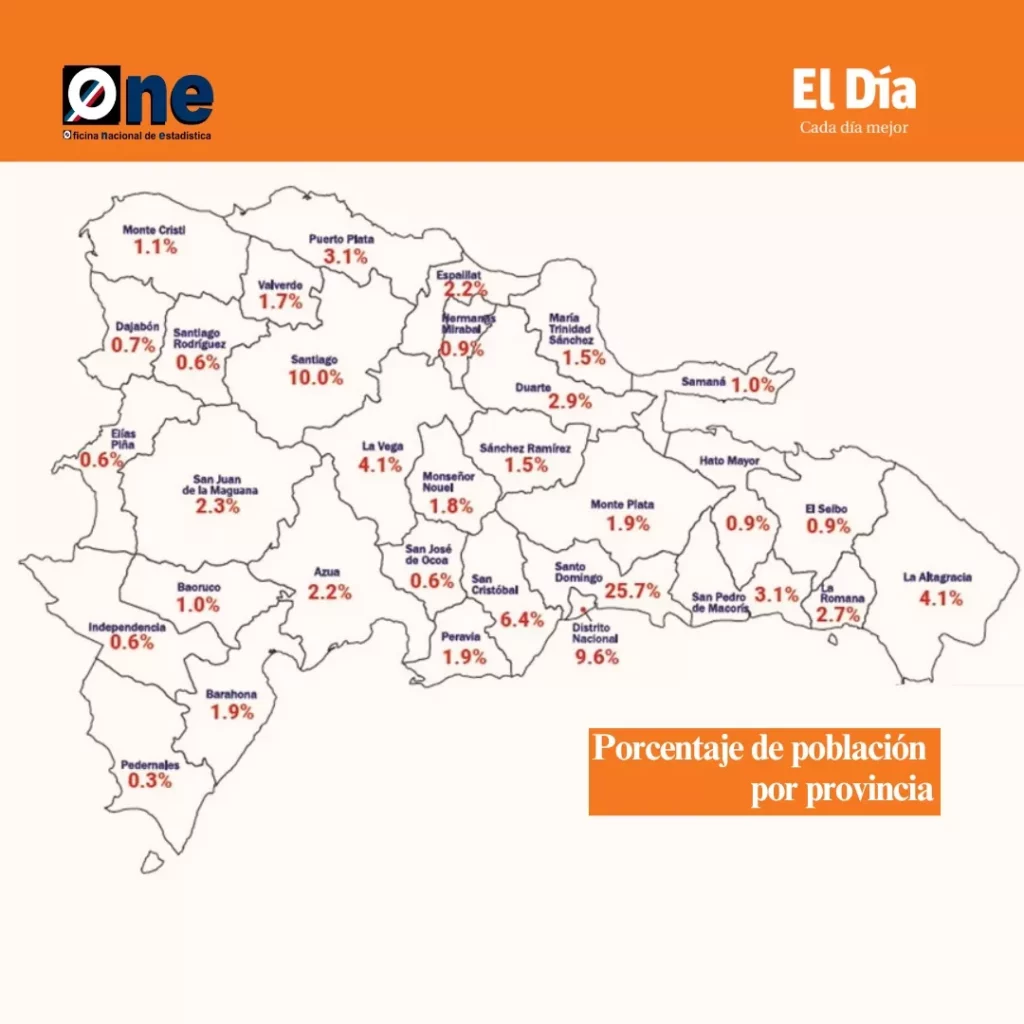 SANTO DOMINGO.– De acuerdo a los resultados preliminares del X Censo Nacional de Población y Vivienda, dados a conocer este jueves por la Oficina Nacional de Estadísticas (ONE), las cinco provincias más pobladas del país son Santo Domingo, Santiago, Distrito Nacional, San Cristóbal y La Altagracia.