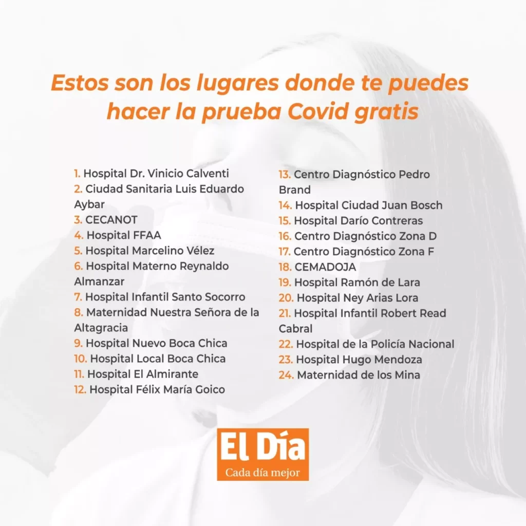 Santo Domingo.- El Ministerio de Salud Pública informó, los 23 hospitales del Gran Santo Domingo para realizar tomas de muestras gratuitas para detectar el Covid-19.