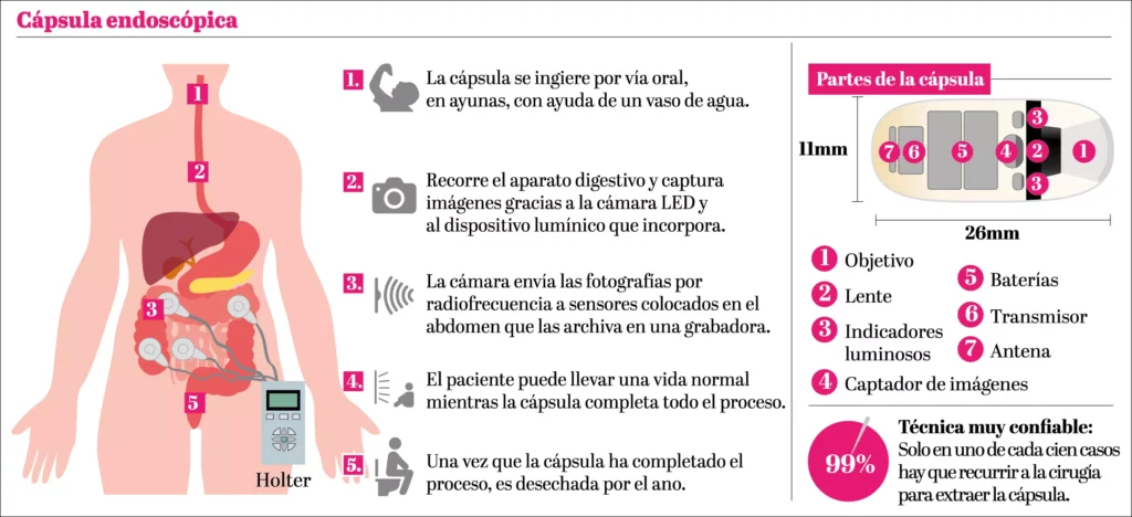 Con lo cual es difícil que se puedan escapar lesiones. Dicha cápsula va avanzando con los movimientos del intestino y es expulsada por el ano.