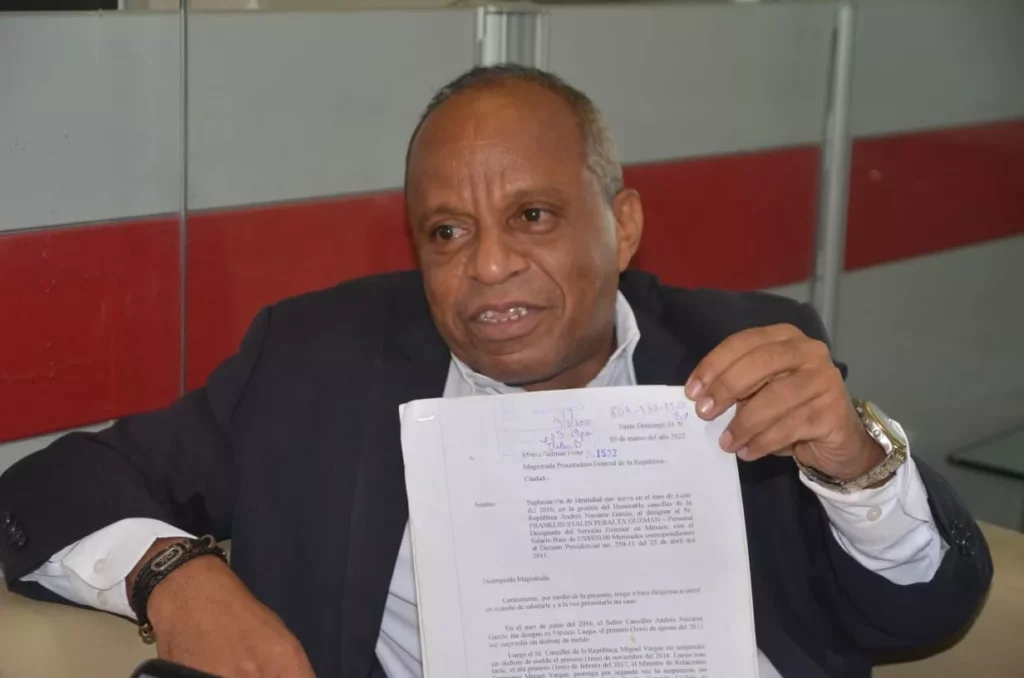 Peralta Guzmán explicó que desde entonces la situación se ha mantenido y que no ha valido que notificara la situación al también excanciller Andrés Navarro y al actual Roberto Alvarez.