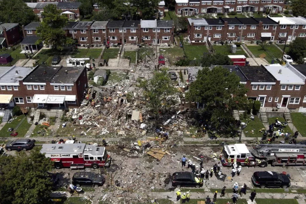 BALTIMORE.— Una explosión de gas natural destruyó tres viviendas adyacentes en Baltimore el lunes, matando a una mujer y dejando a varias personas atrapadas bajo los escombros. Por lo menos dos personas están hospitalizadas con heridas graves, informaron las autoridades.