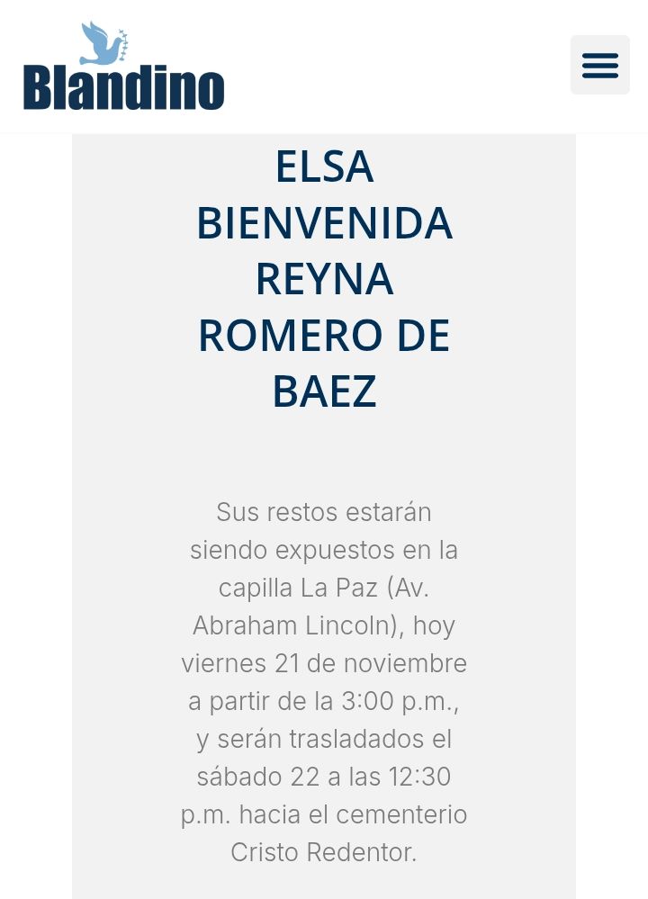 Los restos de Elsa Bienvenida Reyna Romero de Báez serán velados este viernes en la capilla La Paz de la funeraria Blandino, en la avenida Abraham Lincoln, a partir de las 3:00 p.m.