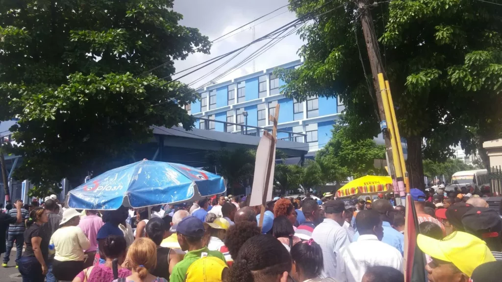 SANTO DOMINGO.- Representantes de cientos de familias de municipio Zambrana, Cotuí, protestaron frente al Banco Central en reclamo del pago de terrenos utilizados por la Barrick Gold que eran de la Rosario Dominicana.