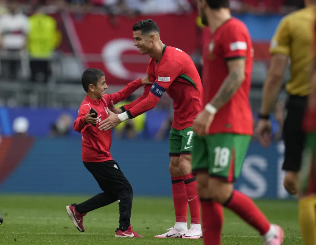 Alemania.- El partido de la segunda jornada del grupo F de la Eurocopa 2024 en el estadio Signal Iduna Park de Dortmund entre Portugal y Turquía se vio interrumpido hasta en cuatro ocasiones por el salto de espontáneos al terreno de juego desde la grada para saludar, tomar una foto o dirigirse a Cristiano Ronaldo. Todo sucedió en el segundo tiempo. Primero fue un niño, al que Cristiano recibió con cariño, con el aplauso del público por su gesto. Después fueron tres personas más, escalonadas, ya entre los signos de enfado del astro luso y los silbidos del público hacia los espontáneos por una nueva interrupción.