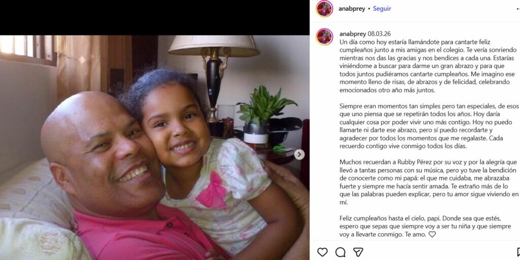 Santo Domingo.– Hoy, en lo que habría sido el cumpleaños del fenecido merenguero dominicano Rubby Pérez, su hija Ana Beatriz le dedicó un emotivo mensaje, lleno de nostalgia y cariño, demostrando que su memoria y legado siempre permanecen vivos en su corazón.