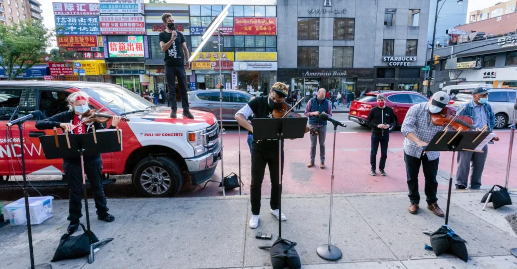 “Hay todo este mito de que Nueva York se está muriendo, pero sólo se está muriendo en los lugares que se construyeron para gente que no es de Nueva York. La gente en Nueva York prospera”, dijo Curtis Stewart, violinista nominado a un Grammy y que se sumó a una actuación del Bandwagon como invitado.