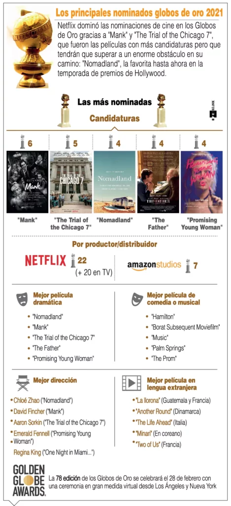 En cuanto al cine, "Mank" y "The Trial of the Chicago 7″ competirán por el Golden Globe a la mejor película dramática frente a "Nomadland" (la gran favorita en esta temporada de premios de Hollywood), "The Father" y "Promising Young Woman".Además, la cinta guatemalteca "La llorona", de Jayro Bustamente, figura entre las nominadas a mejor película en lengua extranjera.