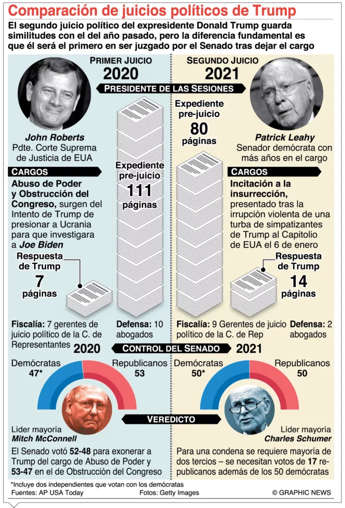 Trump afronta el cargo de haber incitado a la insurrección por el asalto al Capitolio por parte de una turba de sus seguidores, que irrumpió en su interior cuando las dos cámaras del Congreso celebraban una sesión conjunta para refrendar la victoria del demócrata Joe Biden en las elecciones del noviembre.